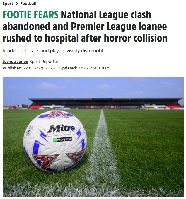 9月3日讯 《太阳报》报道,英格兰全国联赛(第五级别联赛)两名球员头部相撞,比赛直接被叫停。