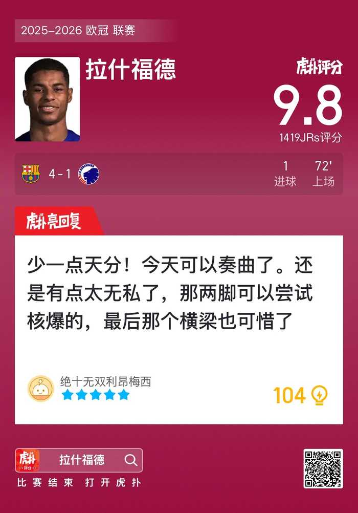 #巴萨4比1哥本哈根#拉什福德打进一球,这场比赛他发挥如何?