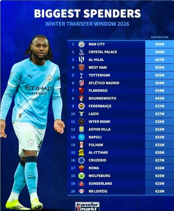 冬季转会窗口已正式关闭,德国转会市场网站盘点了各队冬窗引援的花费情况,遴选出引援投入最高的20支球队,曼城、水晶宫、利雅得新月占据榜单前三,迈阿密国际、吉达联合等球队也跻身榜单之列。