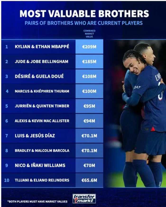 德转发布足坛兄弟身价榜,其中姆巴佩兄弟以2.09亿欧元居首。